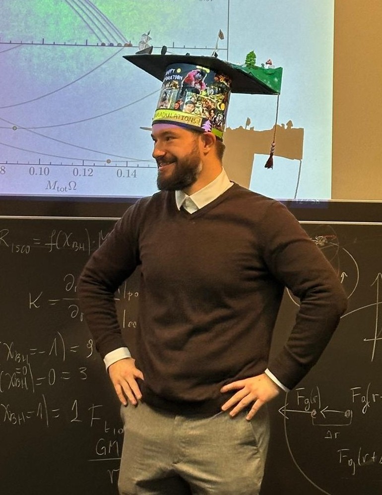 Konrad’s research investigated black hole–neutron star mergers across a wide range of mass ratios and black-hole spins. He systematically identified the conditions that distinguish direct plunge from tidal disruption. By combining quasi-equilibrium models with high-resolution dynamical simulations, he established robust criteria for disk formation, gravitational-wave signatures, and possible electromagnetic counterparts. His work provided key insights for multi-messenger astrophysics. He also showed that features of the post-merger gravitational-wave spectrum follow quasi-universal relations, helping constrain neutron-star matter through GW observations.