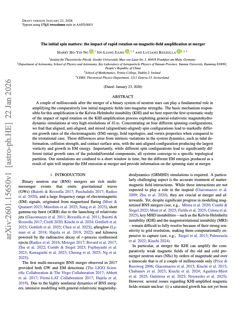 | The initial spin matters: the impact of rapid rotation on magnetic-field amplification at merger, Preprint arXiv[2601.15650] (2026) | Harry Ho-Yin NG, Jin-Liang Jiang, and Luciano Rezzolla | ![]() |
