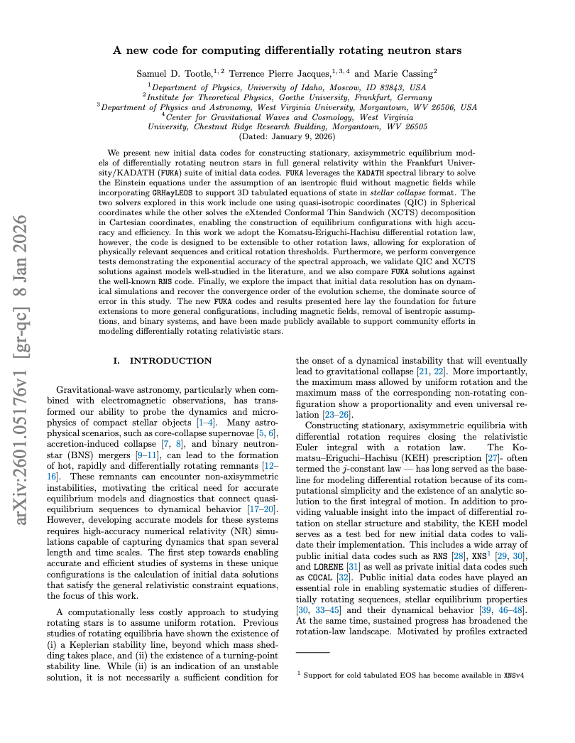 | A new code for computing differentially rotating neutron stars, Preprint arXiv[2601.05176] (2026) | Samuel D. Tootle, Terrence Pierre Jacques, and Marie Cassing | ![]() |