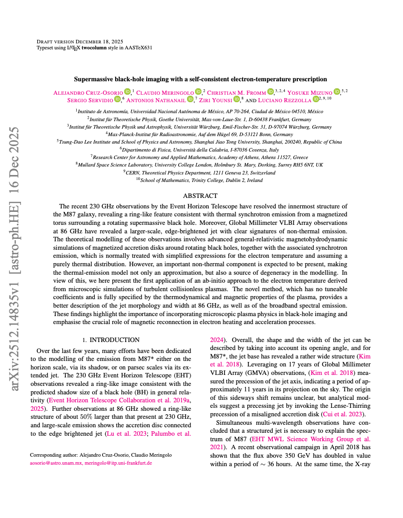 | Supermassive black-hole imaging with a self-consistent electron-temperature prescription, Preprint arXiv[2512.14835] (2025) | Alejandro Cruz-Osorio, Claudio Meringolo, Christian M. Fromm, Yosuke Mizuno, Sergio Servidio, Antonios Nathanail, Ziri Yunsi, and Luciano Rezzolla | ![]() |