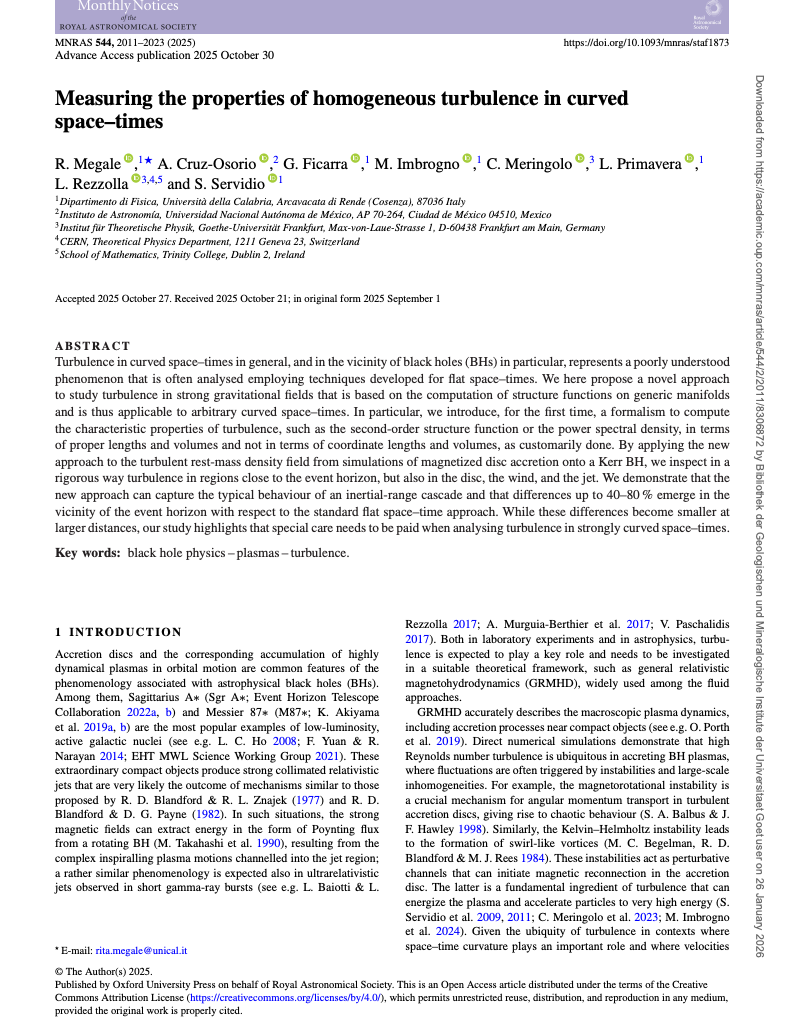 | Measuring the properties of homogeneous turbulence in curved space–times, MNRAS 544, 2011–2023 (2025) | Rita Megale, Alejandro Cruz-Osorio, Giuseppe Ficarra, Mario Imbrogno, Claudio Meringolo, Leonardo Primavera, Luciano Rezzolla, and Sergio Servidio | ![]() |