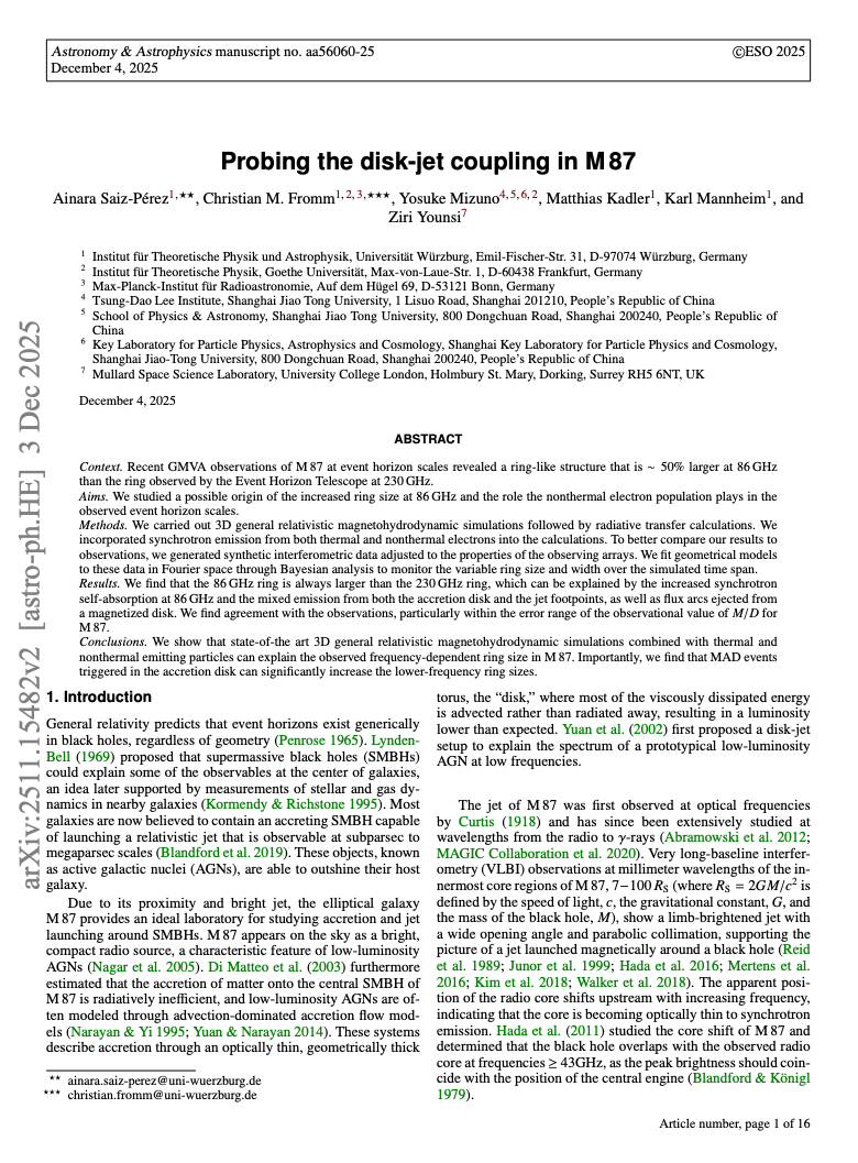| Probing the disk-jet coupling in M87, Preprint arXiv[2511.15482] (2025) | Ainara Saiz-Pérez, Christian M. Fromm, Yosuke Mizuno, Matthias Kadler, Karl Mannheim, and Ziri Younsi | ![]() |