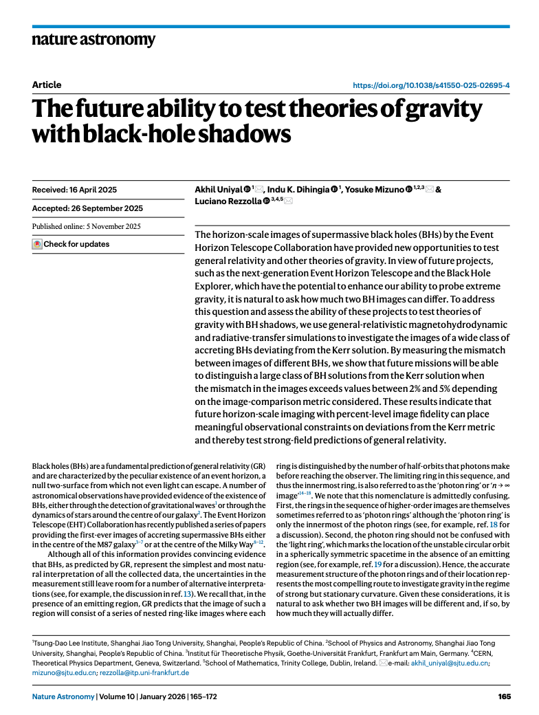 | The future ability to test theories of gravity with black-hole shadows, Nature Astronomy 10, 165–172 (2025) | Akhil Uniyal, Indu K. Dihingia, Yosuke Mizuno, and Luciano Rezzolla | ![]() |