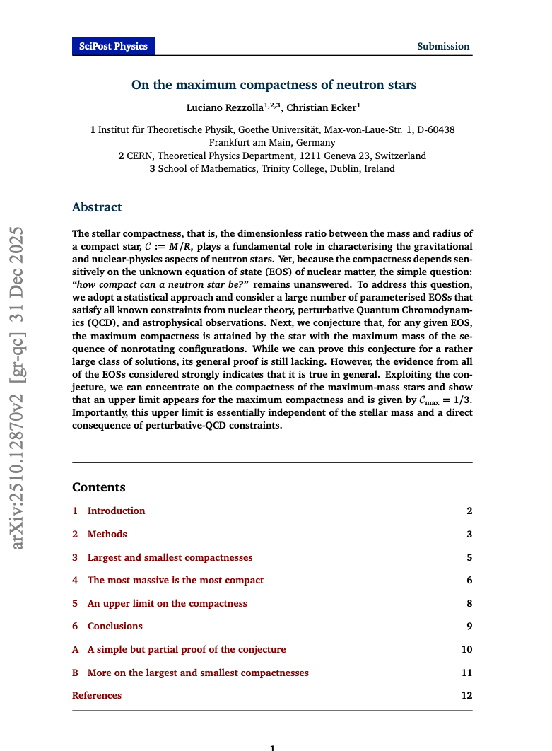 | On the maximum compactness of neutron stars, Preprint arXiv[2510.12870] (2025) | Luciano Rezzolla and Christian Ecker | ![]() |