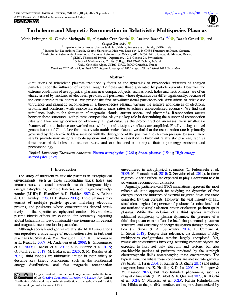 | Turbulence and Magnetic Reconnection in Relativistic Multi-Species Plasmas, ApJ 992 (1), L8 (2025) | Mario Imbrogno, Claudio Meringolo, Alejandro Cruz-Osorio, Luciano Rezzolla, Benoît Cerutti, and Sergio Servidio | ![]() |